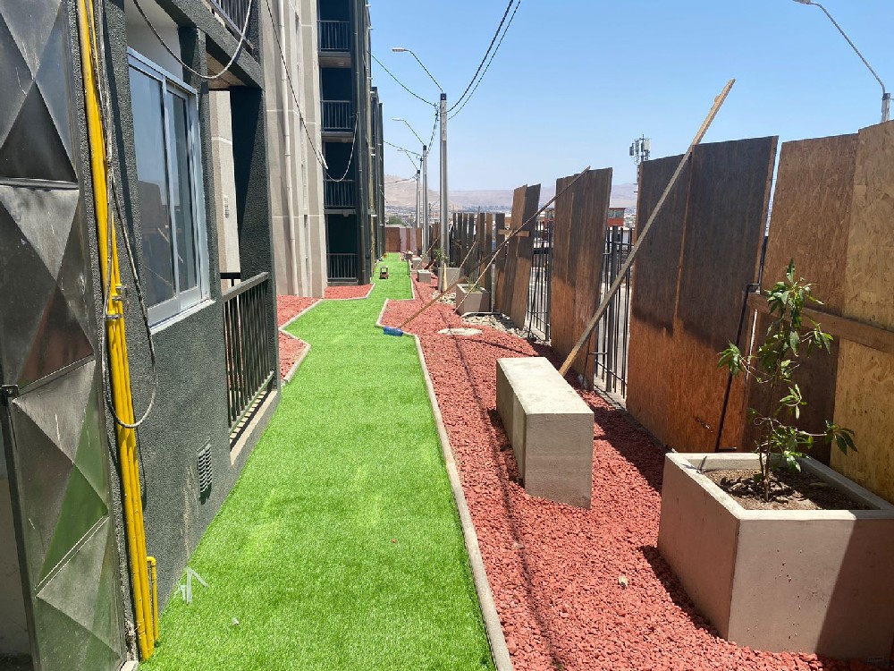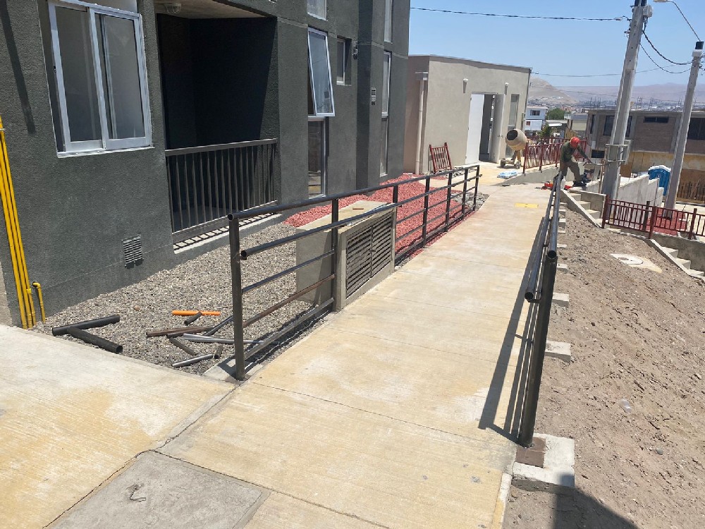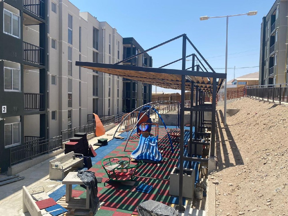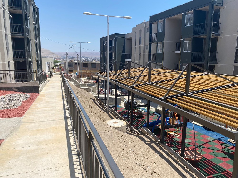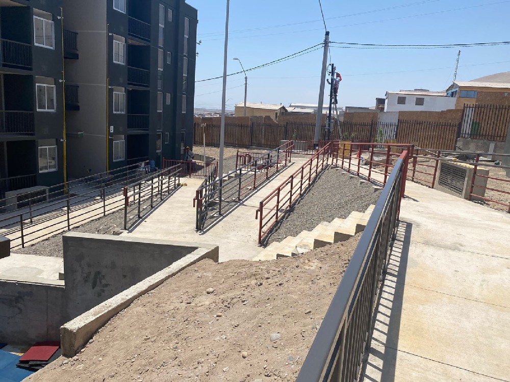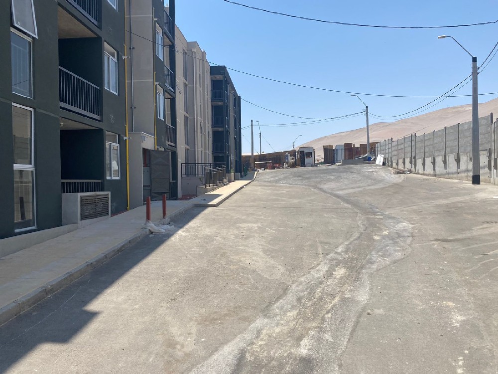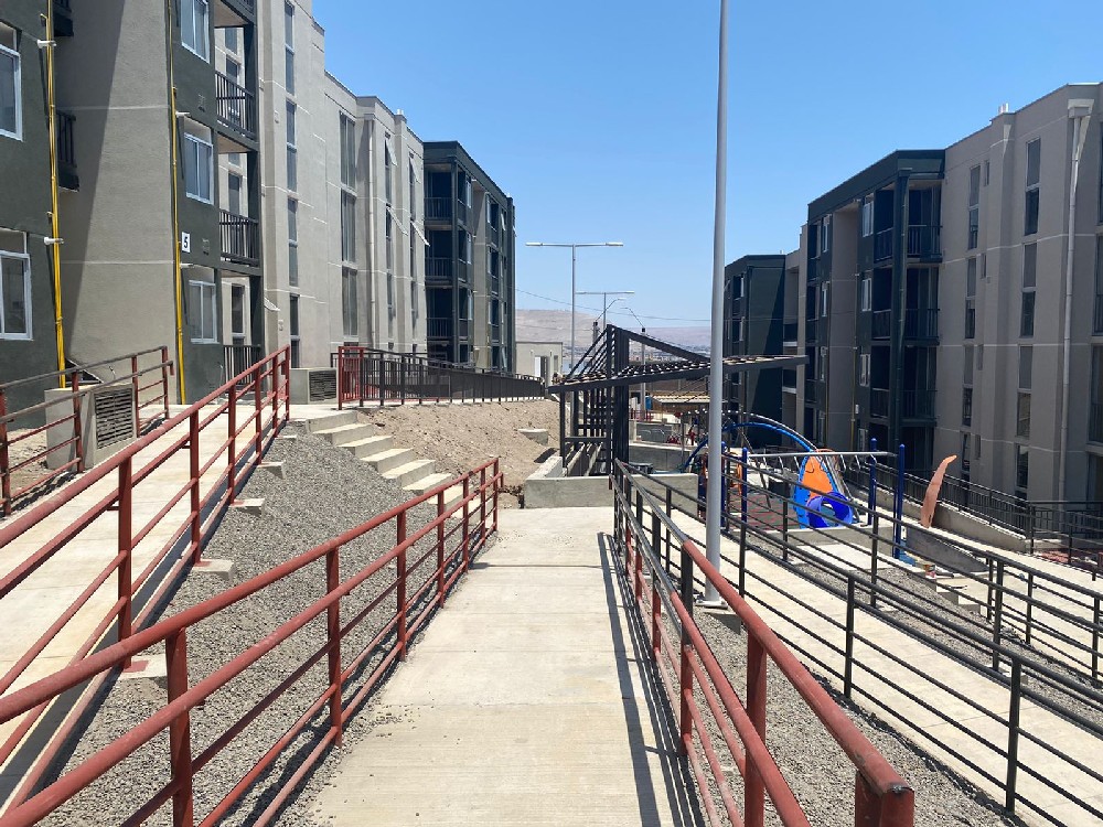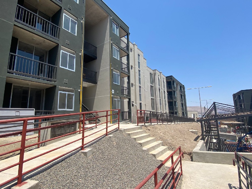 Corresponde a la construcción de edificios con un total de 72 departamentos de 62 m2 c/u app., con 3 dormitorios, baño, cocina, logia y estar-comedor, más zonas de esparcimiento y áreas verdes, comuna de Arica, 100% terminada y entregada. |